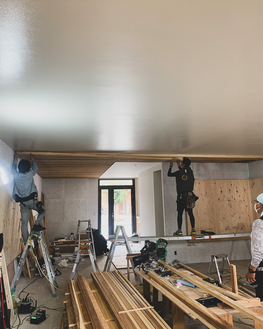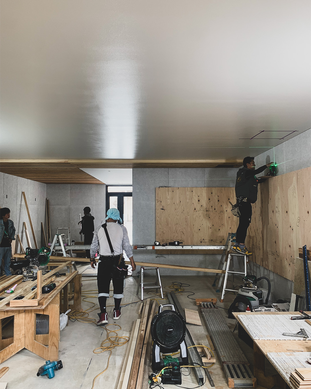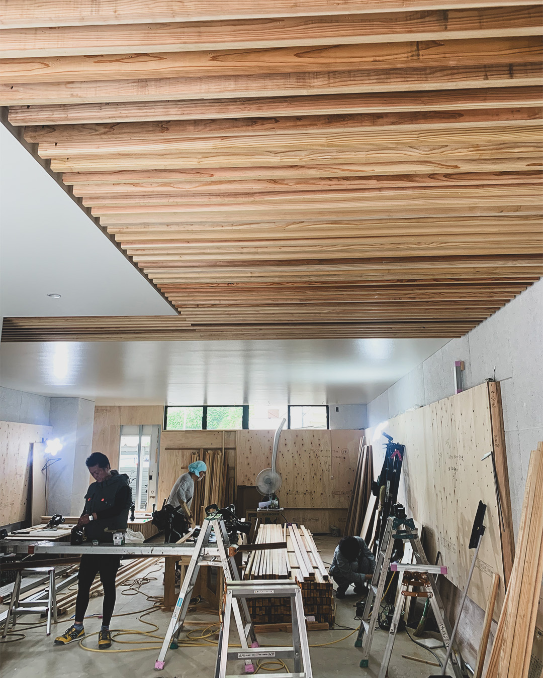 入口のスチールドアが設置され、受付カウンターや棚、壁面の木毛板、そして天井ルーバーなど、今回の空間を象徴するディテールが現場でひとつずつ組み上がっていきます。特に天井のルーバーは、ピッチをしっかりと確認しながら、職人さんが連携して施工を進めていきます。