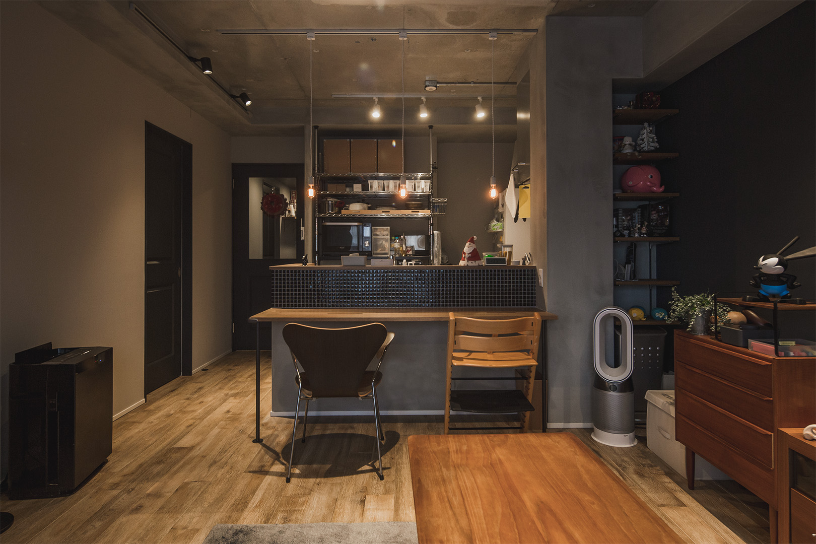 「洋室とリビングの間にあった扉を取り外して生まれたスペースによって、寛ぎの余白が作れたと思います。加えて子どもが自由に動き回れるし、妻の家事動線の確保もできましたね」。さらに、キッチンと連動するダイニングカウンターを設置したのも、リビングをより広く使うための工夫だった。