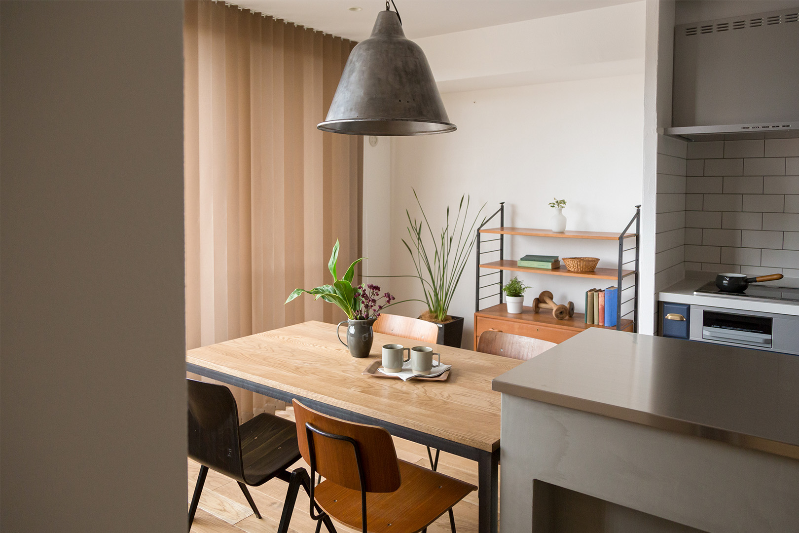 施工では和室とダイニングが隣り合う窮屈な間仕切りを取り払うことで、広々したリビングダイニングを実現。また、生活動線の観点からキッチンはダイニングの壁側に移設。結果、収納スペースも同じ壁側に集約できるのに加え、有効なスペースにステンレスカウンターやダイニングテーブルを特注サイズで設えることができた。