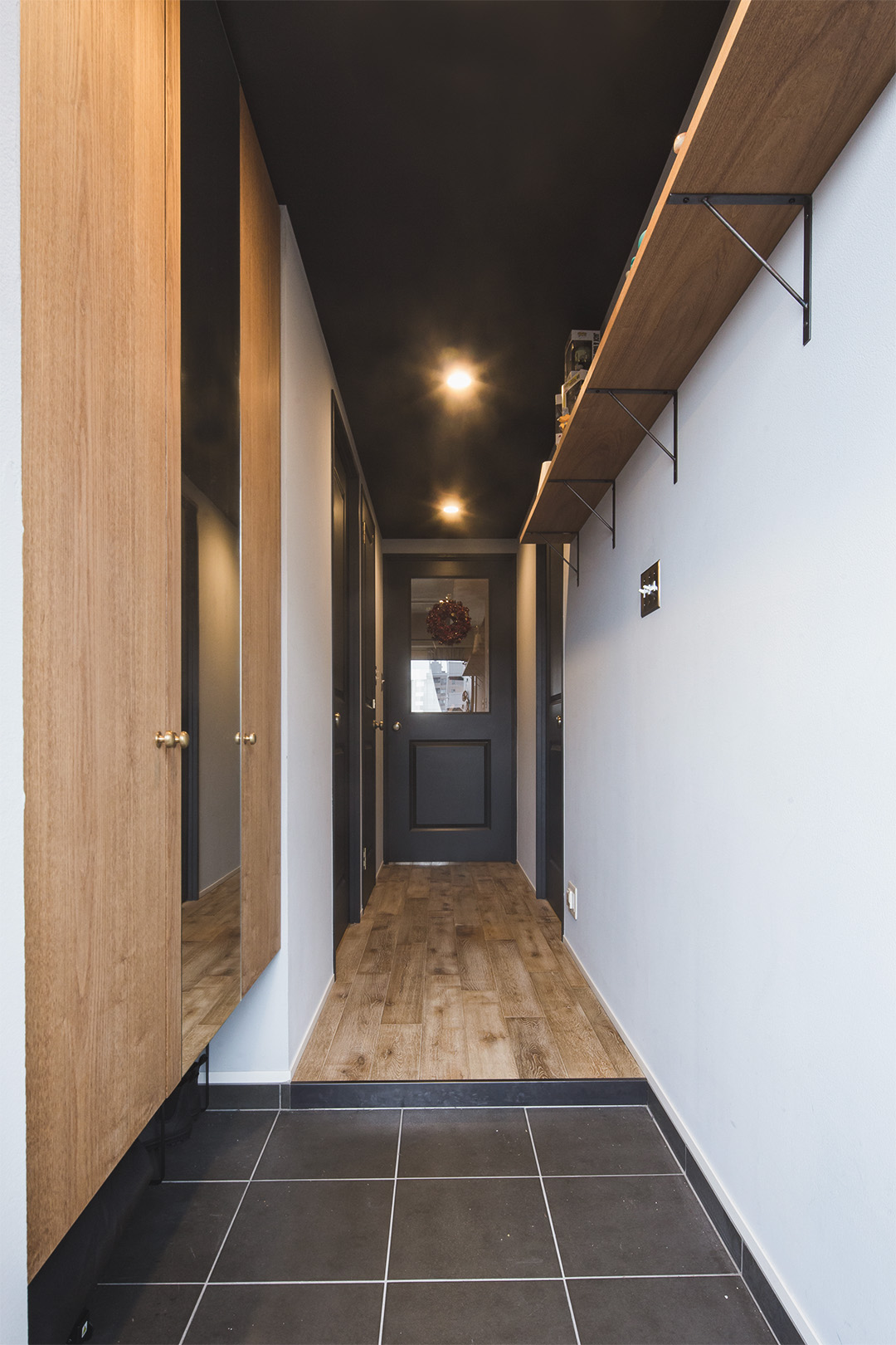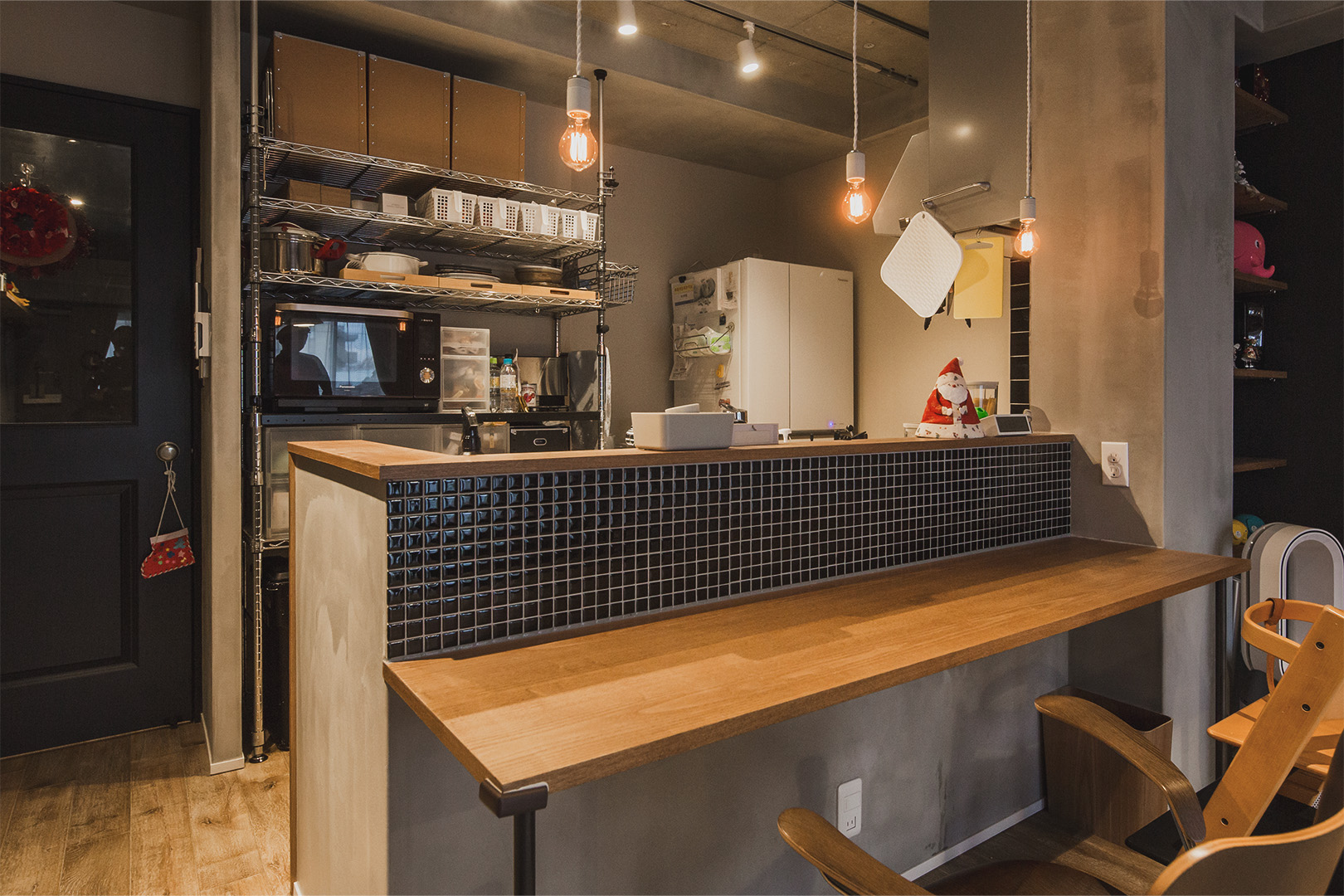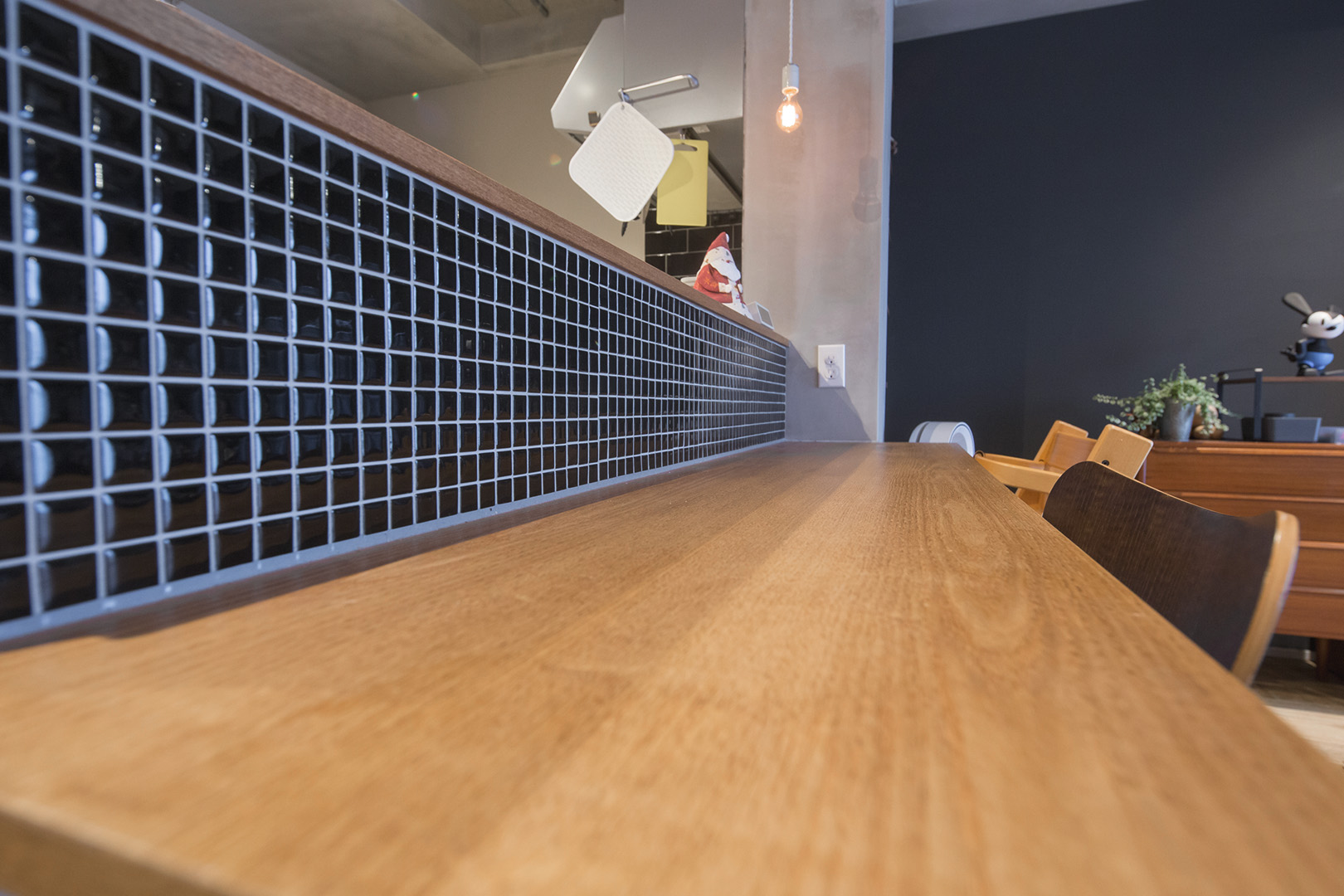 また、ウォークインクローゼットや土間、広々とした水回りスペースの確保など次々に溢れ出す空間イメージをかなえるために、90平米の部屋を選択。当初検討していた部屋の広さが70〜80平米ですから、大幅なスケール変更でした。一方、可動パーテーションを開け放ったリビングと直結するキッチンやフードカウンターも家人のこだわりのひとつ。時には「ゲストルーム」としてリビングを活用できるよう、食事やお酒を複数で楽しめるL字型のカウンターをオリジナルで設えました。
