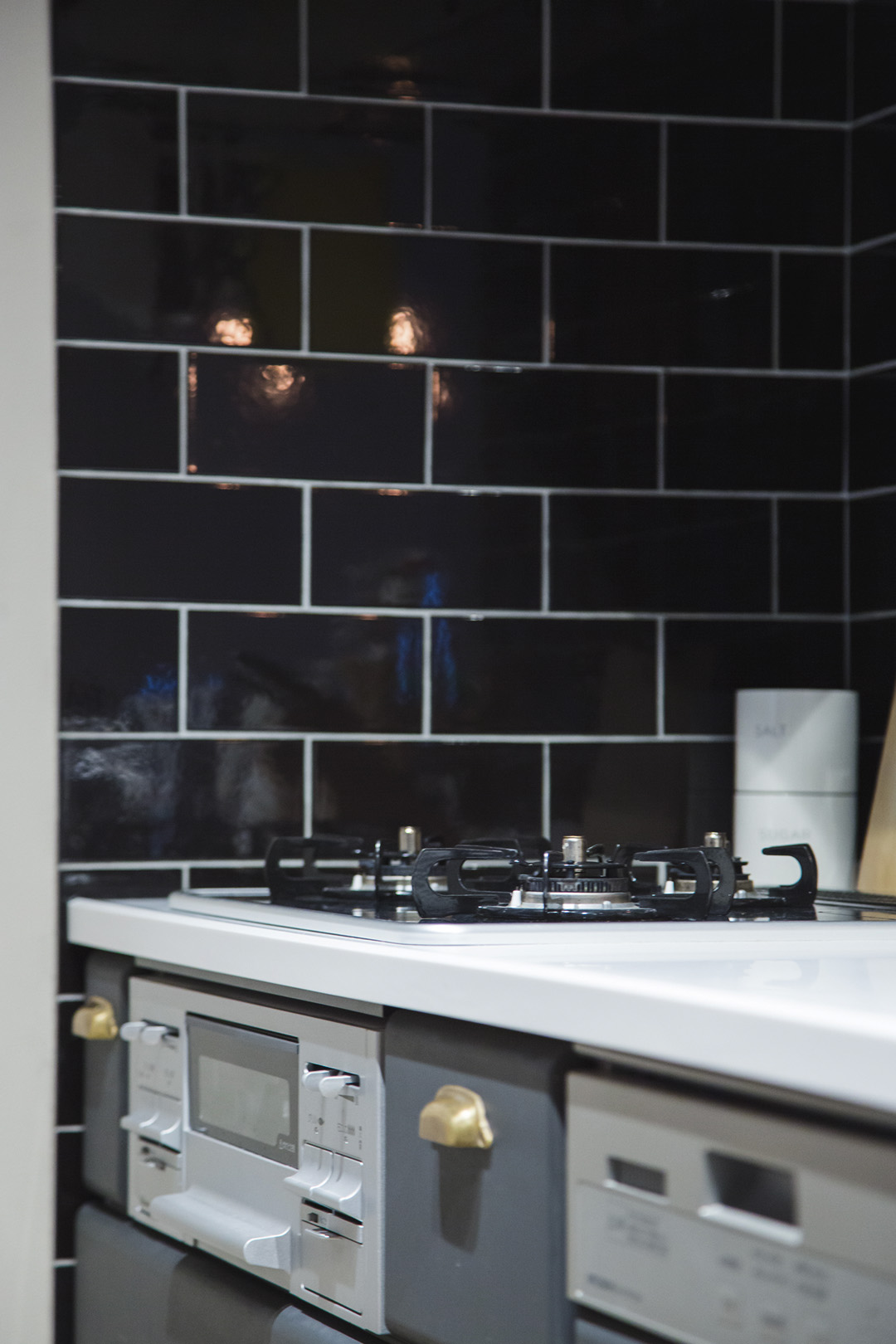 特に主役となるキッチンスペースには、白いタイル、モルタルの収納&作業台、ネイビーのキッチン、オークの収納棚など素材感の違うものを組み合わせました。