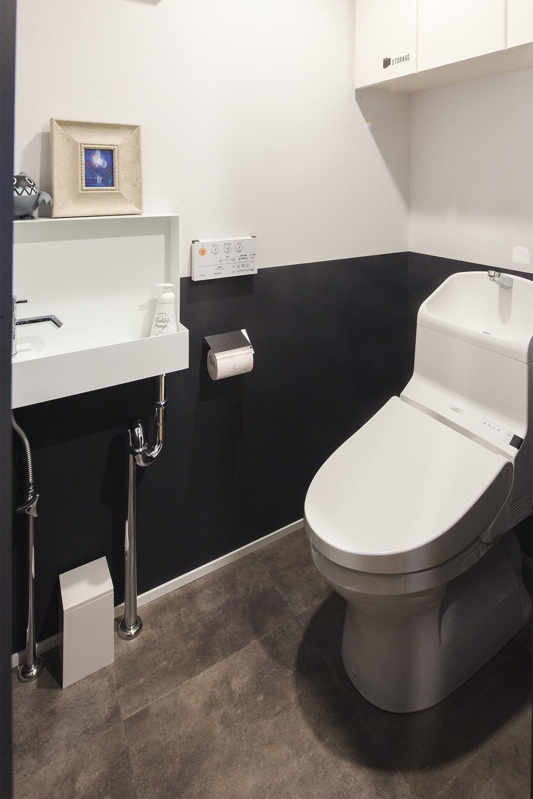 漆喰と黒の塗装で仕上げた壁、キッチン、洗面室もテーマにそって家具やお持ちの雑貨がレイアウトしやすいようにシンプルにデザインを心掛けました。