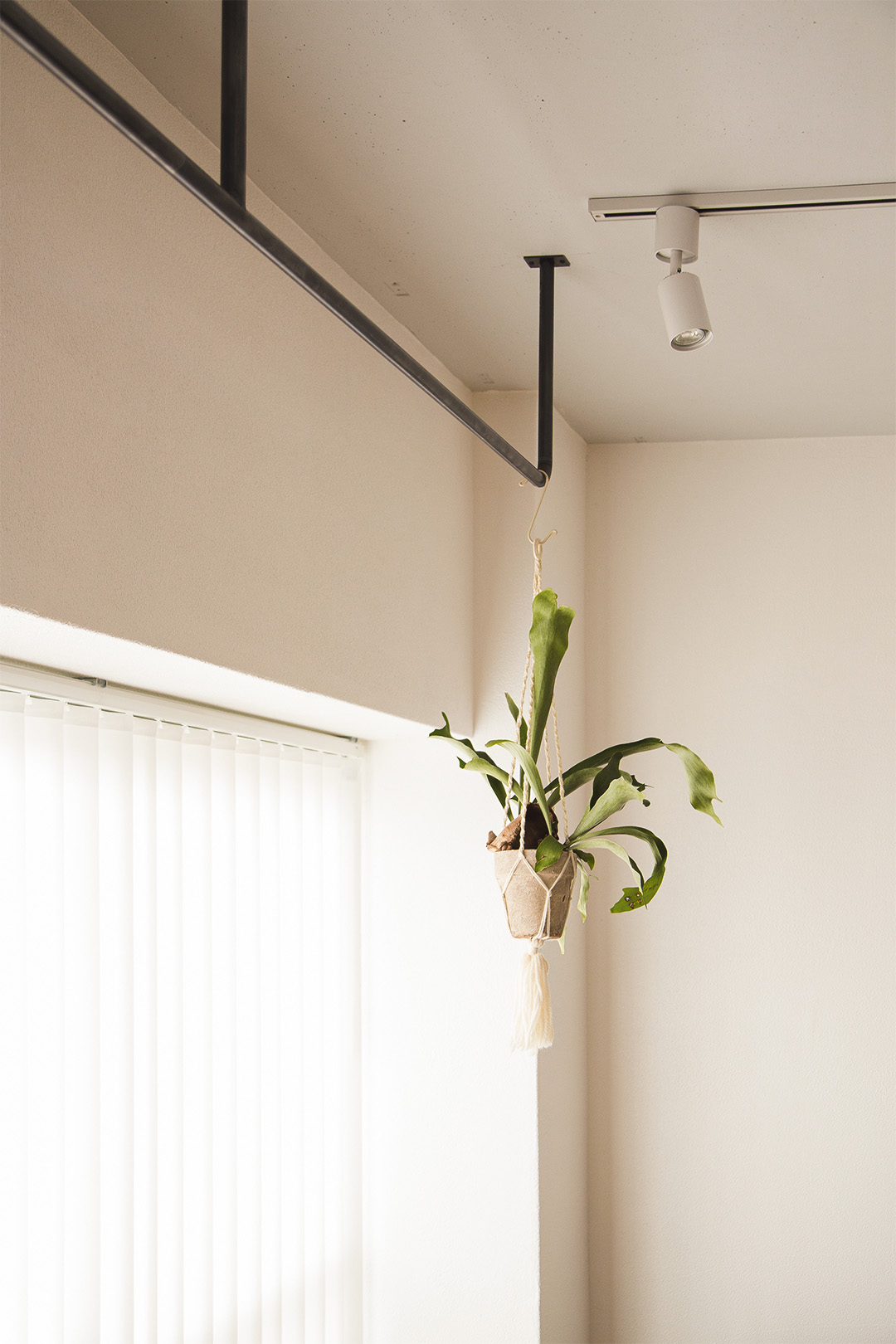 洋室を1つ減らし、バルコニー側の眺望を確保した広いLDKがこの家の主役。窓から入る光を反射する白い壁を基調に、明るいナチュラルカラーのフローリング、アクセントにモルタル壁仕上げ。さらに、キッチンとバックカウンターも白、タイルは表面に艶があり面状が波打った白いタイルを採用。これにより奥まった位置にあるキッチンでも明るさを確保できるようにしました。さらに、Amazon Echoで操作可能な照明システムを導入し、天気や時間帯によって簡単にライティングをコントロールできるようにしました。