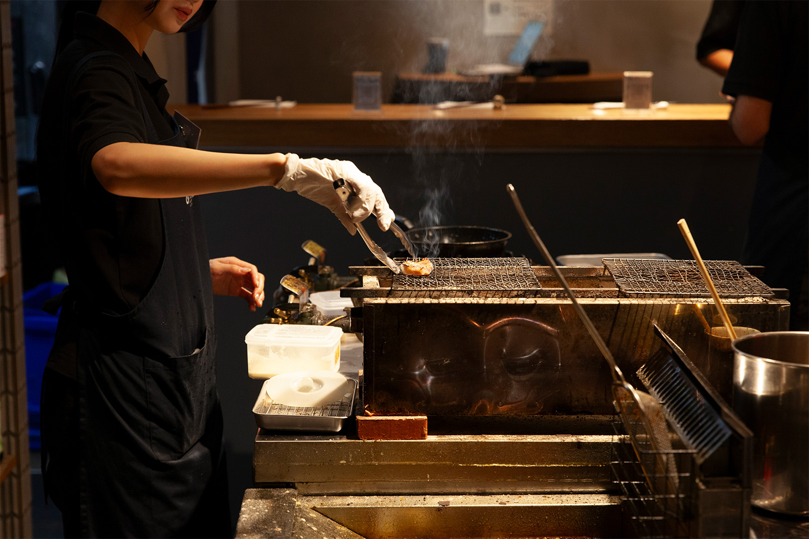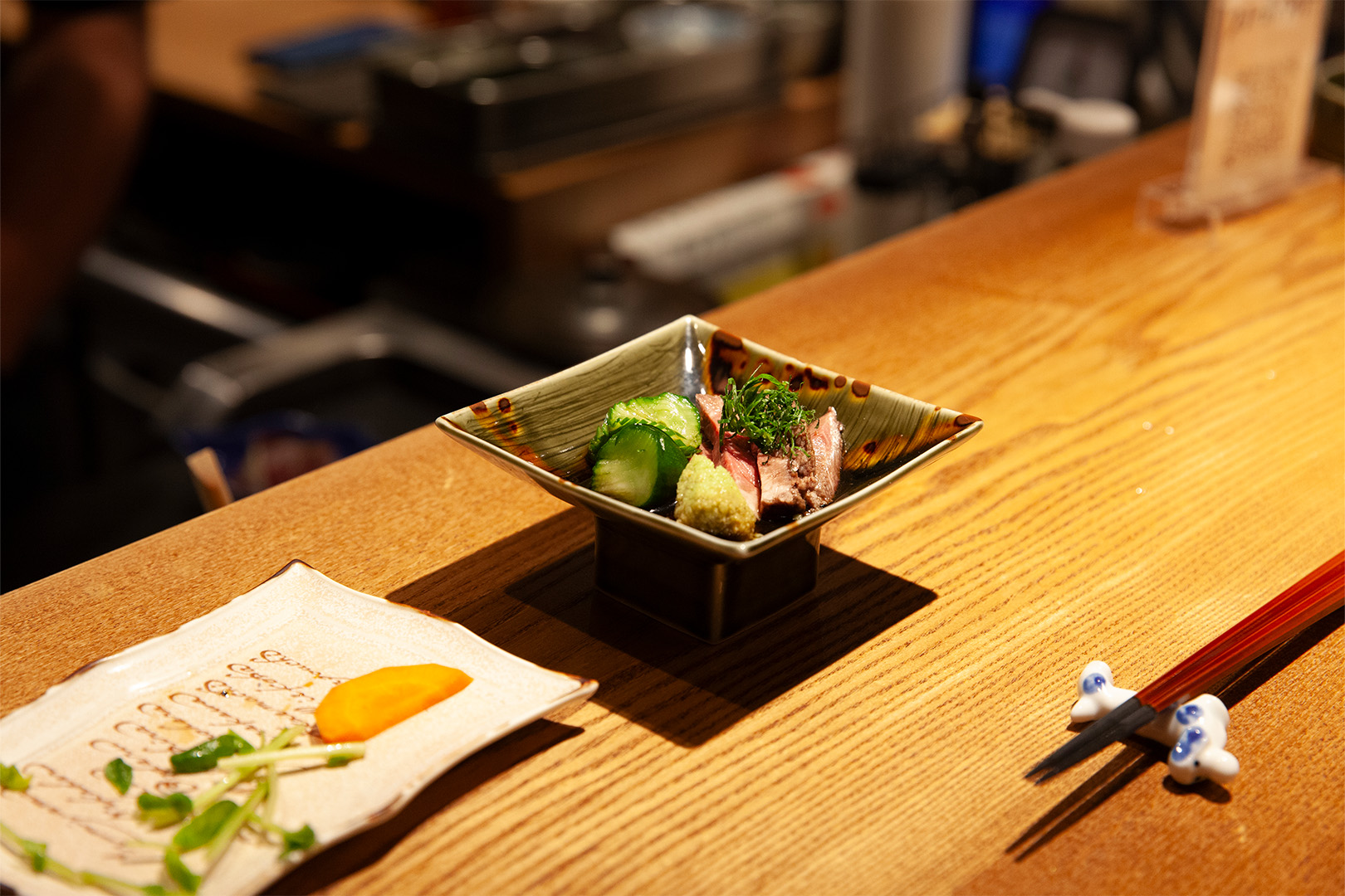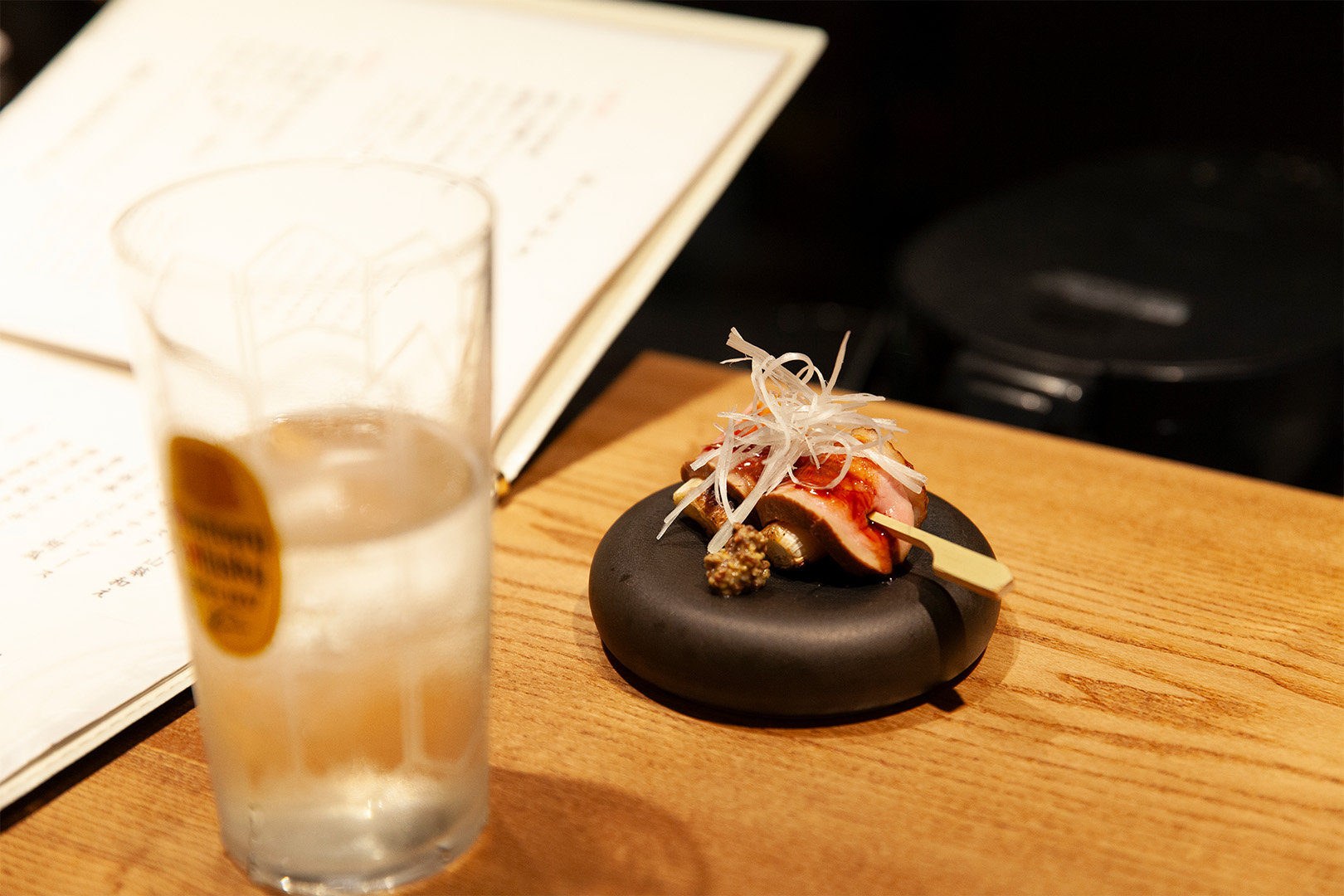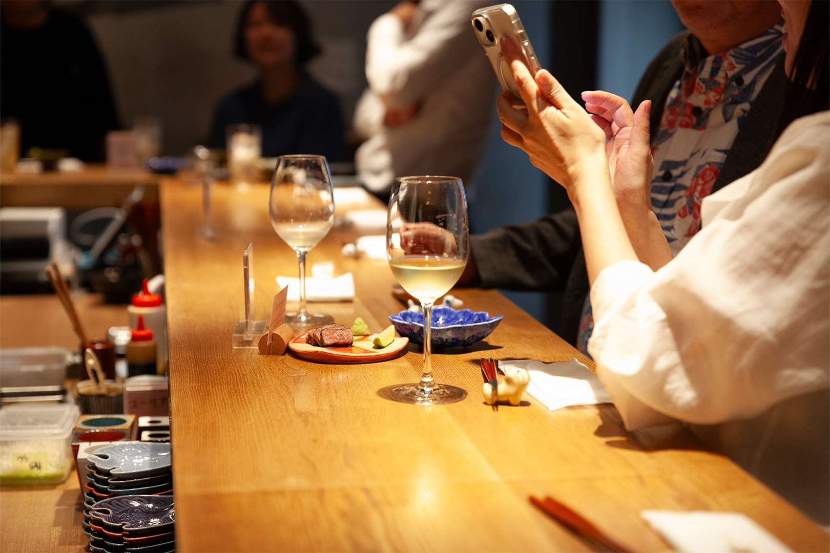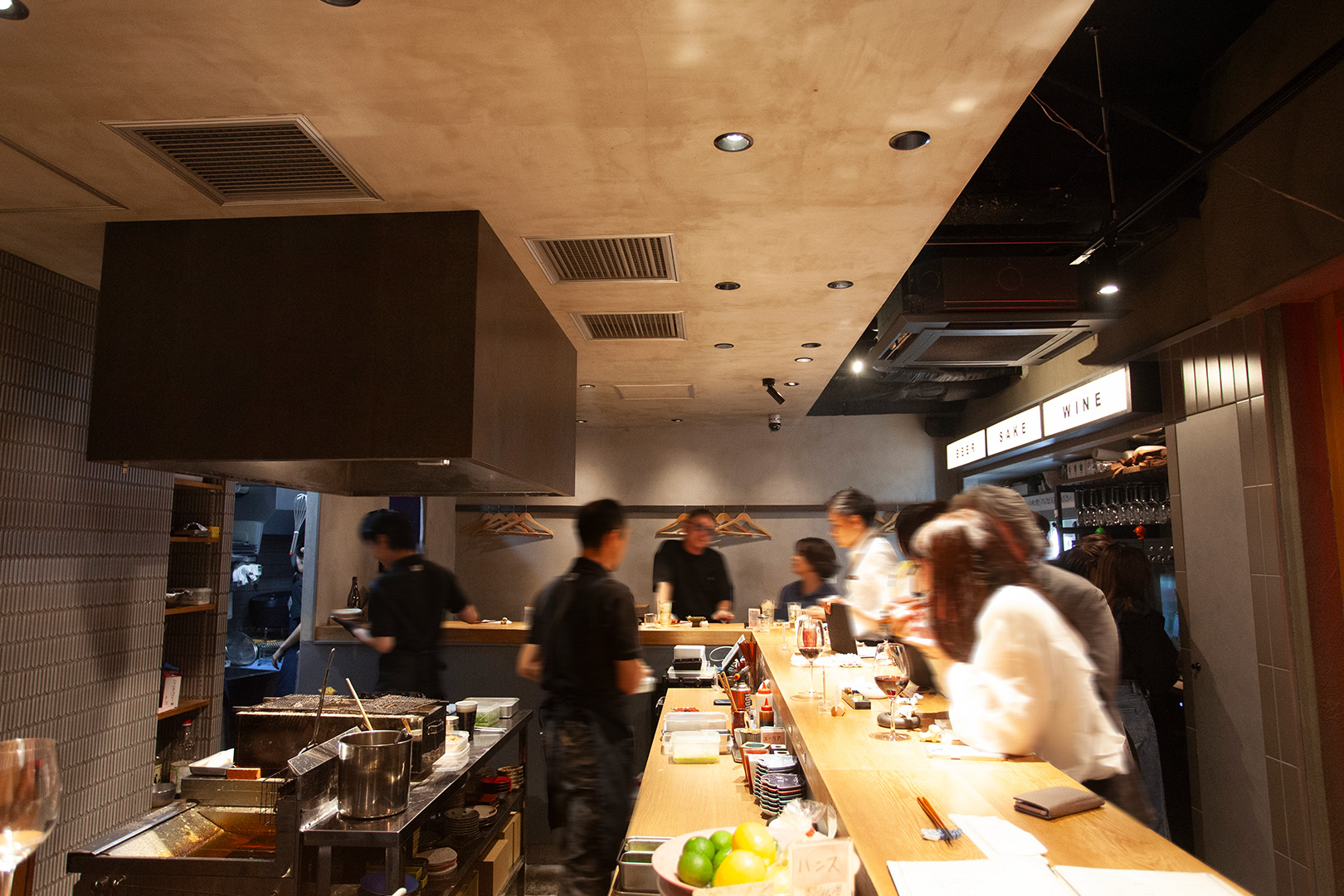 店内はコの字型カウンターを中心に構成し、一人でも、誰かとでも自然に居場所が見つかるレイアウトに。視線が抜ける上部のスペースの見せ方や、アクセントとして配したネオンサインが、空間にほどよい軽やかさとリズムを与えています。