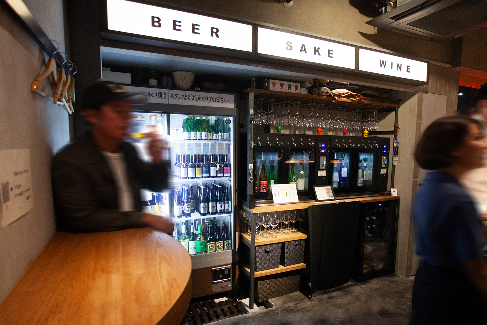 店内の主役となるのが、日本酒とワインのコインサーバー。お客様自身がコインを入れて、グラスに注ぐという少し遊び心のある仕組みを取り入れています。このコーナーをどう見せるかが、デザインのひとつの軸でした。