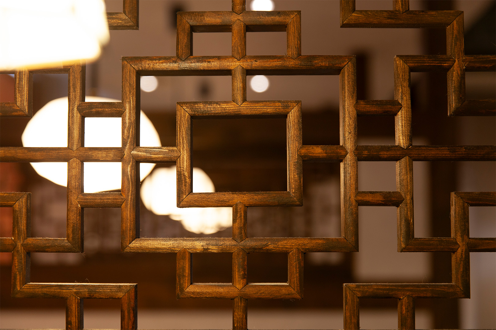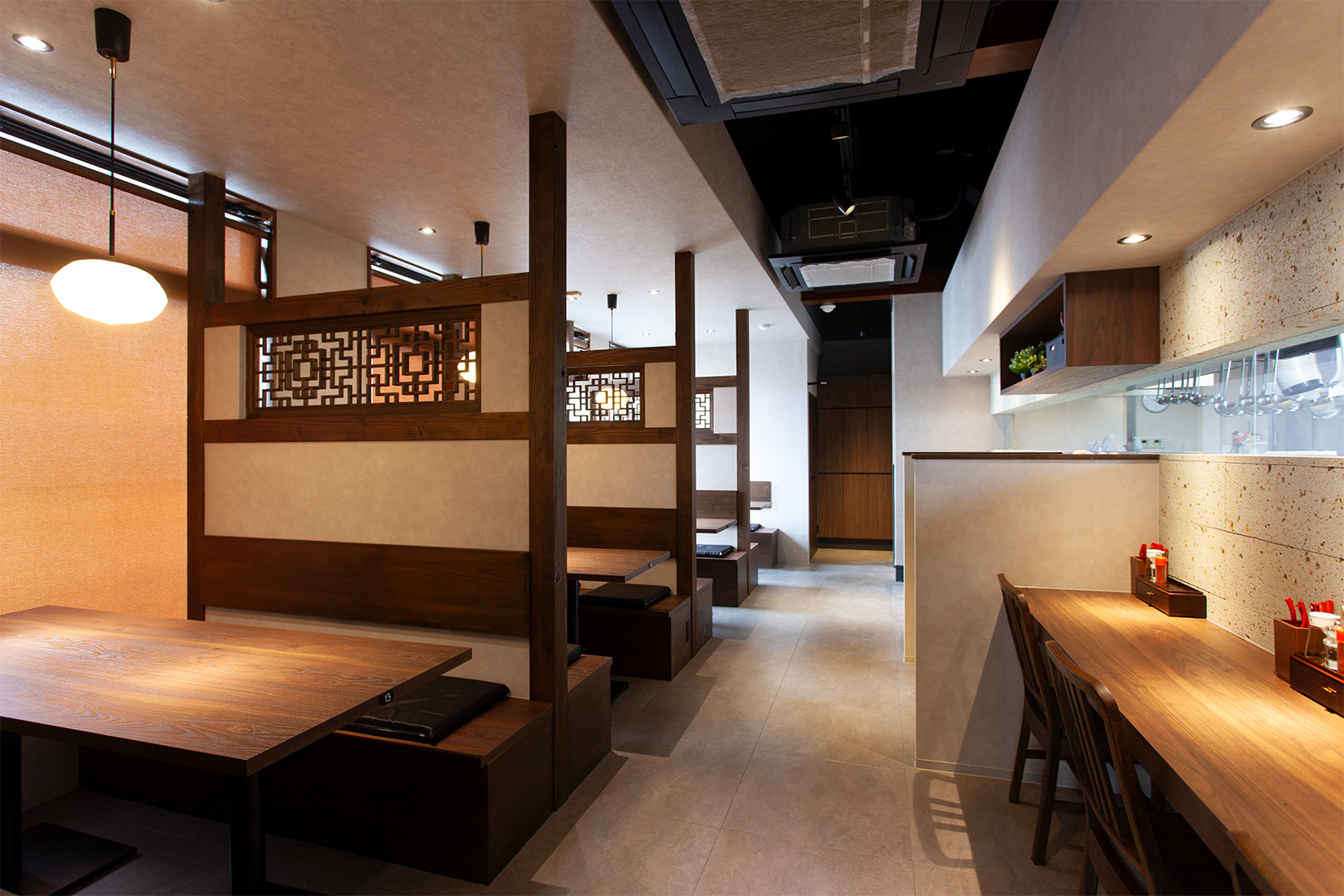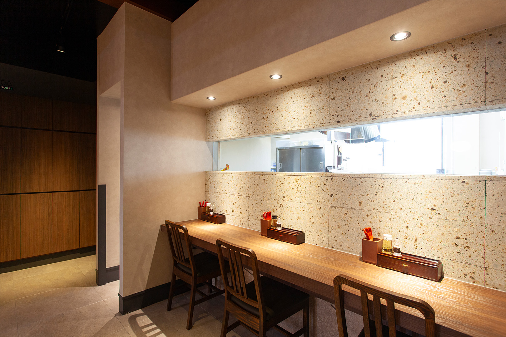 中華格子や、大谷石を用いたカウンターまわりは、空間の印象を決めるポイントとして取り入れました。格子や柱は、古民家の木部のような落ち着いた色味で塗装し、素材の質感が自然に伝わるトーンにまとめています。「派手ではないけれど、居心地がいい」そんな空気感を目指した仕上がりです。